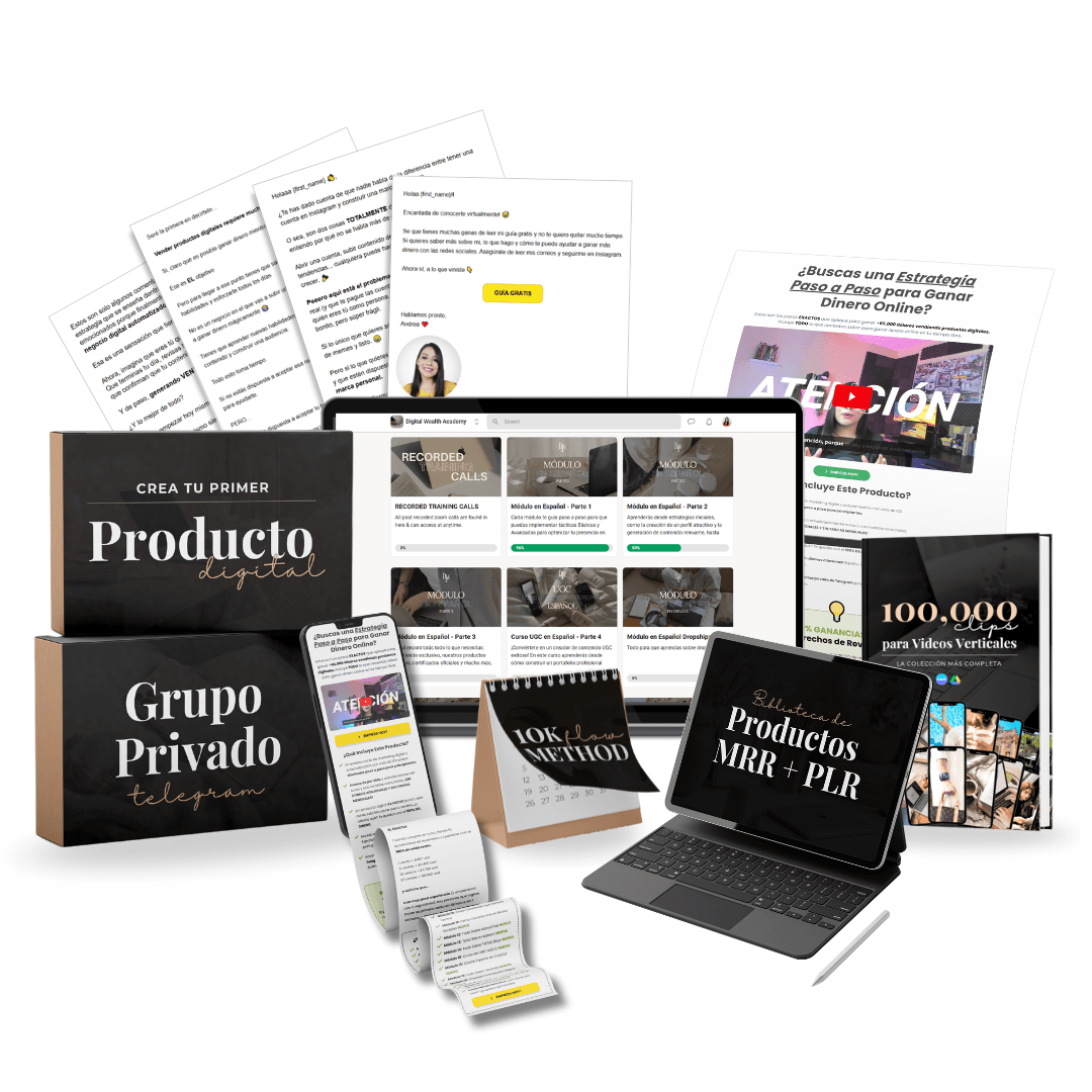 El producto en sí es un curso COMPLETO de marketing digital, que te enseña paso a paso cómo ganar dinero online con productos digitales y redes sociales